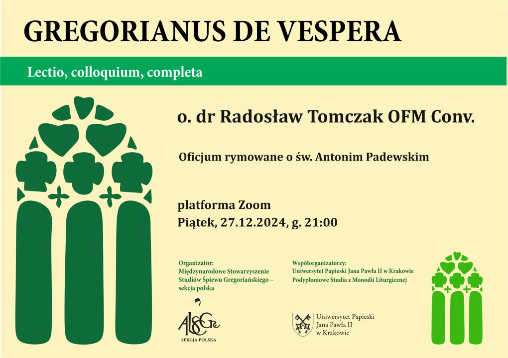 Sekcja polska Międzynarodowego Stowarzyszenia Studiów Śpiewu Gregoriańskiego we współpracy ze Studiami Podyplomowymi z Monodii Liturgicznej UPJPII organizuje w wyznaczone piątki on-line’owe spotkania „Gregorianus de vespera. Lectio, colloquium, completa” poświęcone śpiewowi gregoriańskiemu. Rozpoczynają się wykładem zaproszonego gościa, po nim następuje dyskusja a kończą się wieczorną modlitwą.